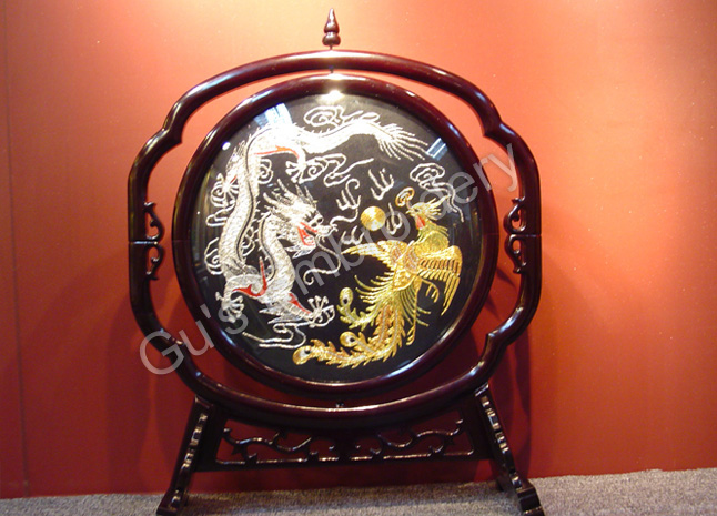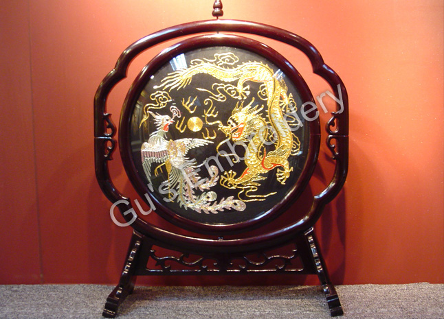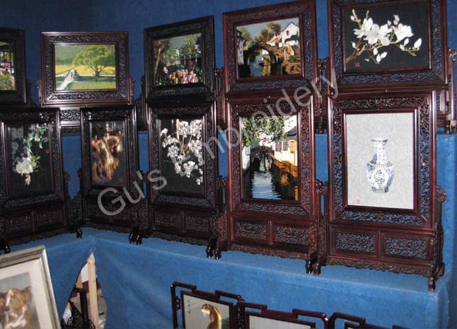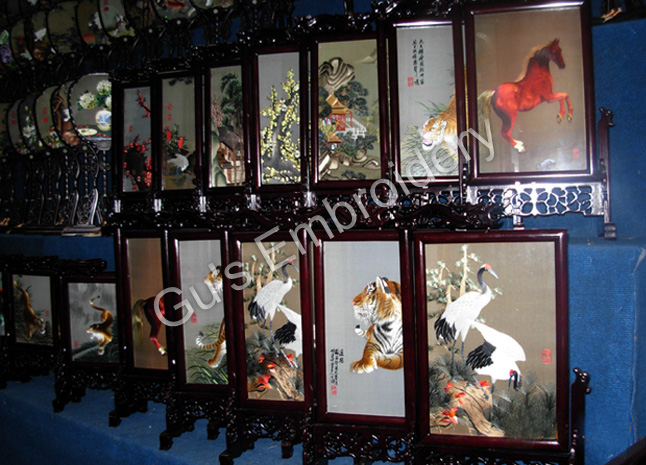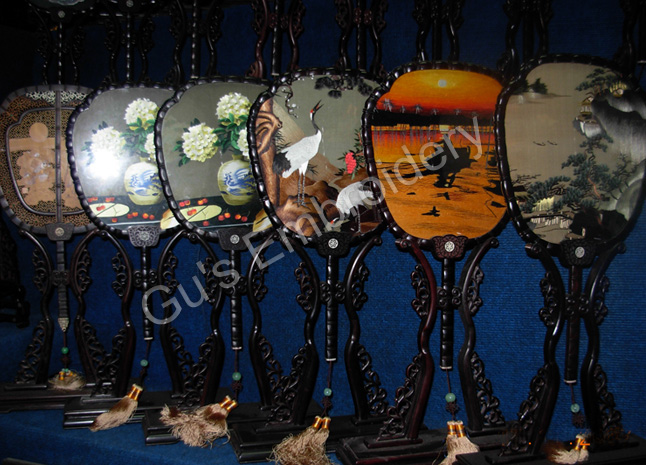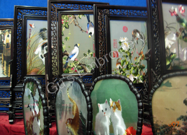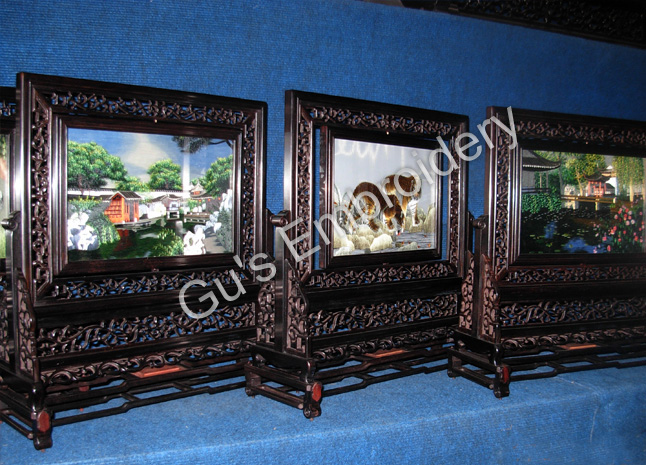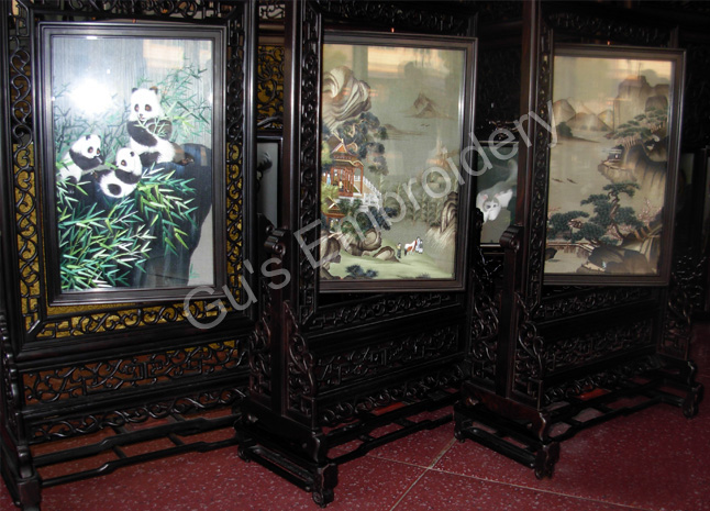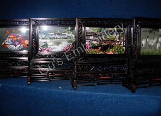 all the pictues showed in this page are all double side embroideries.Some is small as A4 size paper, some is as tall as an adult.Double side means that you may appreciate the embroidery from two sides,some can be reversed. Some of the stands of the embroidery are made with rose wood.